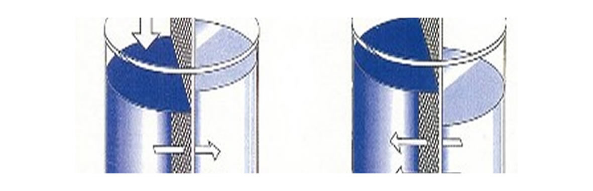 Se noi esercitiamo sulla soluzione a piu’ elevata salinita’ una pressione maggiore della pressione osmotica, possiamo invertire il processo, forzando la parte acquosa della soluzione a maggior concentrazione a passare attraverso la membrana: in questo secondo caso solo l’acqua pura riesce ad attraversarla, andando ad incrementare la quantita’ di acqua a minor concentrazione (chiamata permeato) nel contenitore di destra, lasciando ovviamente una soluzione piu’ concentrata di quella di partenza (detta appunto concentrato) nel contenitore che in figura e’ rappresentato a sinistra.